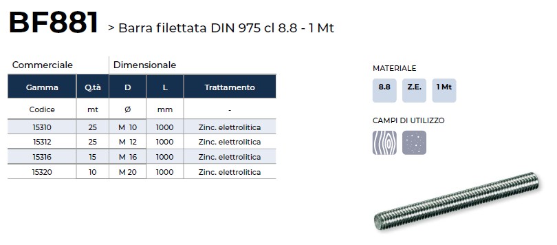 Barra filettata DIN 975 cl 8.8 - 1 Mt