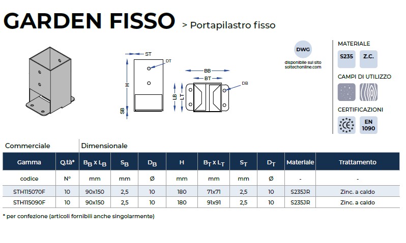 I Portapilastri della Linea Garden sono elementi in acciaio robusti, versatili e facili da installare, ideali per l'esecuzione di recinzioni e staccionate in legno e, in generale, per quelle opere da realizzare in ambienti in cui l'aspetto paesaggistico assume particolare rilevanza. Soltech srl propone due modelli: un portapilastro fisso per opere con sviluppo complanare e un portapilastro inclinabile con un'escursione fino a circa 60° in entrambe le direzioni per opere con sviluppo in pendenza. Applicazione: possono essere fissati su un supporto rigido in calcestruzzo oppure infissi direttamente nel terreno tramite l'apposito fittone accessorio.