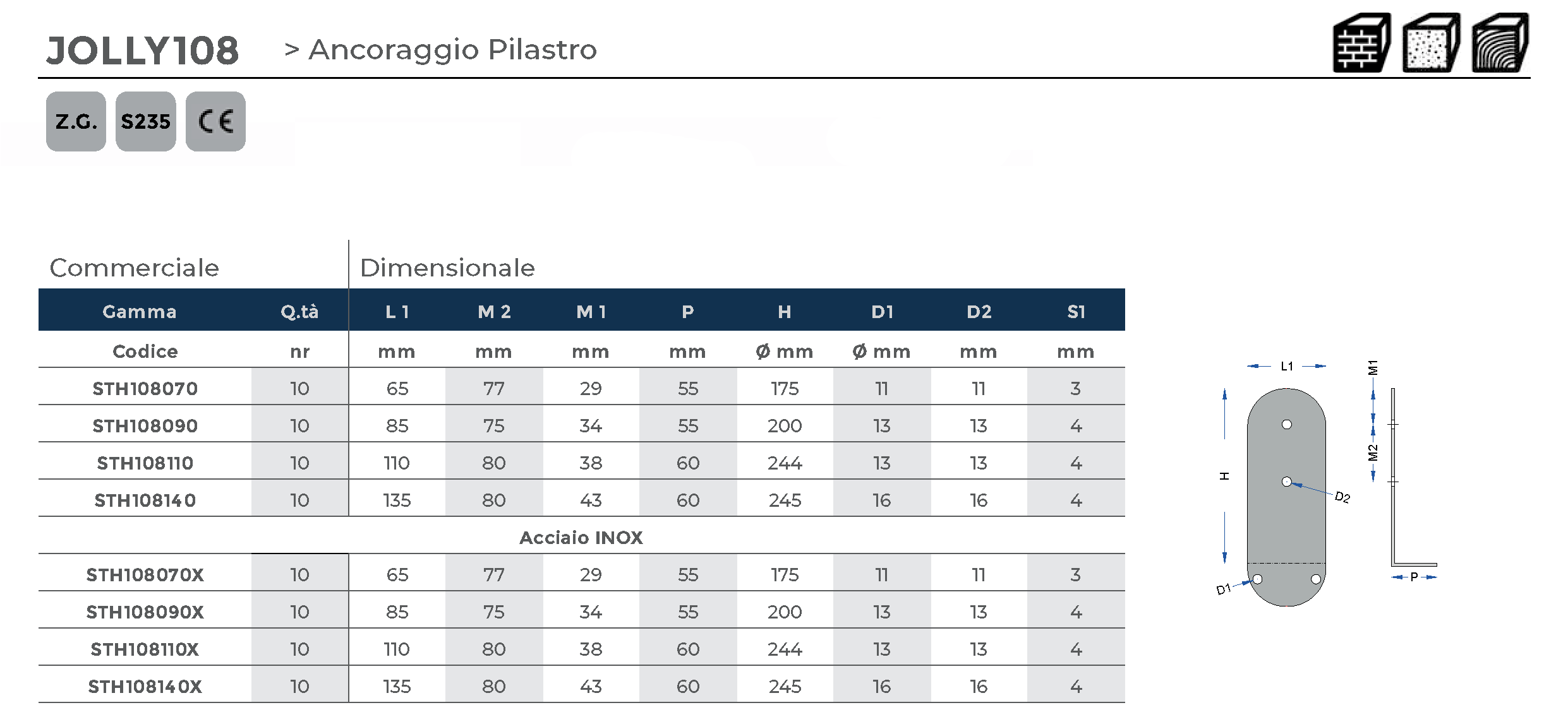 Ancoraggio per pilastri realizzato in acciaio S235 con trattamento di zincatura tropicalizzata