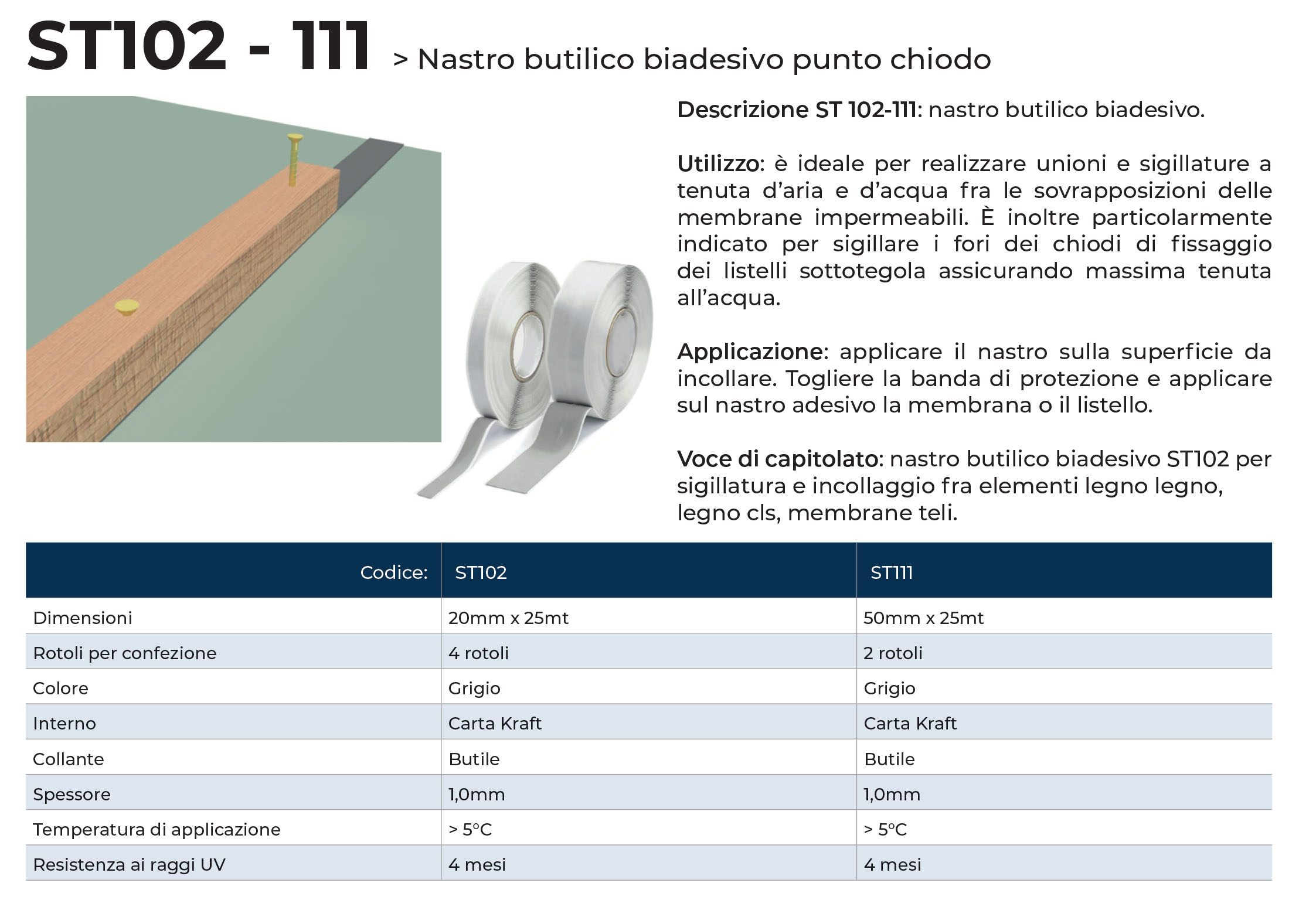 Ideale per la realizzazione di unioni e sigillature a tenuta d'aria e d'acqua fra le sovrapposizioni delle membrane impermeabili e particolarmente indicato per sigillare i fori degli elementi di fissaggio dei listelli sottotegola, assicurando la massima tenuta all'acqua. Applicazione: applicare il nastro sulla superificie da incollare, togliere la banda di protezione e applicare sul nastro adesivo la membrana o il listello.