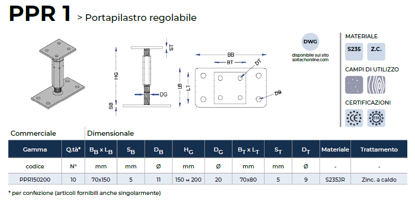 portapilastri PPR sono portapilastri regolabili facili da installare, senza la necessità di eseguire ulteriori lavorazioni di finitura, preforatura e fresatura sul legno, con elevata capacità portante nei confronti dei carichi verticali di trazione e compressione. L’altezza dei portapilastri PPR può essere regolata anche dopo il montaggio, per compensare le tolleranze di lavorazione connesse alla progettazione, nonché i successivi assestamenti delle fondazioni. Applicazioni: i portapilastri PPR vengono utilizzati per giunzioni all’esterno, su fondazioni in cemento armato, di pilastri in legno massiccio C24 o superiore e legno lamellare, in classi di servizio 1, 2 e 3 secondo la norma DIN EN 1995-1-1. Materiale: acciaio da costruzione S235JR zincato a caldo secondo DIN EN ISO 12944-2 (C3).