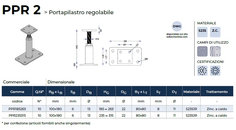 I portapilastri PPR sono portapilastri regolabili facili da installare, senza la necessità di eseguire ulteriori lavorazioni di finitura, preforatura e fresatura sul legno, con elevata capacità portante nei confronti dei carichi verticali di trazione e compressione. L’altezza dei portapilastri PPR può essere regolata anche dopo il montaggio, per compensare le tolleranze di lavorazione connesse alla progettazione, nonché i successivi assestamenti delle fondazioni. Applicazioni: i portapilastri PPR vengono utilizzati per giunzioni all’esterno, su fondazioni in cemento armato, di pilastri in legno massiccio C24 o superiore e legno lamellare, in classi di servizio 1, 2 e 3 secondo la norma DIN EN 1995-1-1. Materiale: acciaio da costruzione S235JR zincato a caldo secondo DIN EN ISO 12944-2 (C3).