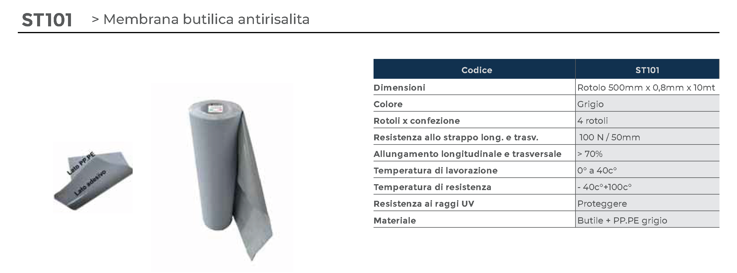 Membrana butilica adesiva con un film in PP.PE. Si consiglia come membrana antirisalita dell’umidità alla base della parete in legno così da evitare il contatto diretto con la pavimentazione esistente . Altamente adesiva si può posizionare sulla base della parete o stendere sul CLS da entrambi i lati. Si consiglia di applicare la membrana su superfici asciutte prive di polvere o grassi, il collante butilico non essicca e non indurisce quindi il suo potere adesivo rimane nel tempo tenace ed è facile da modellare