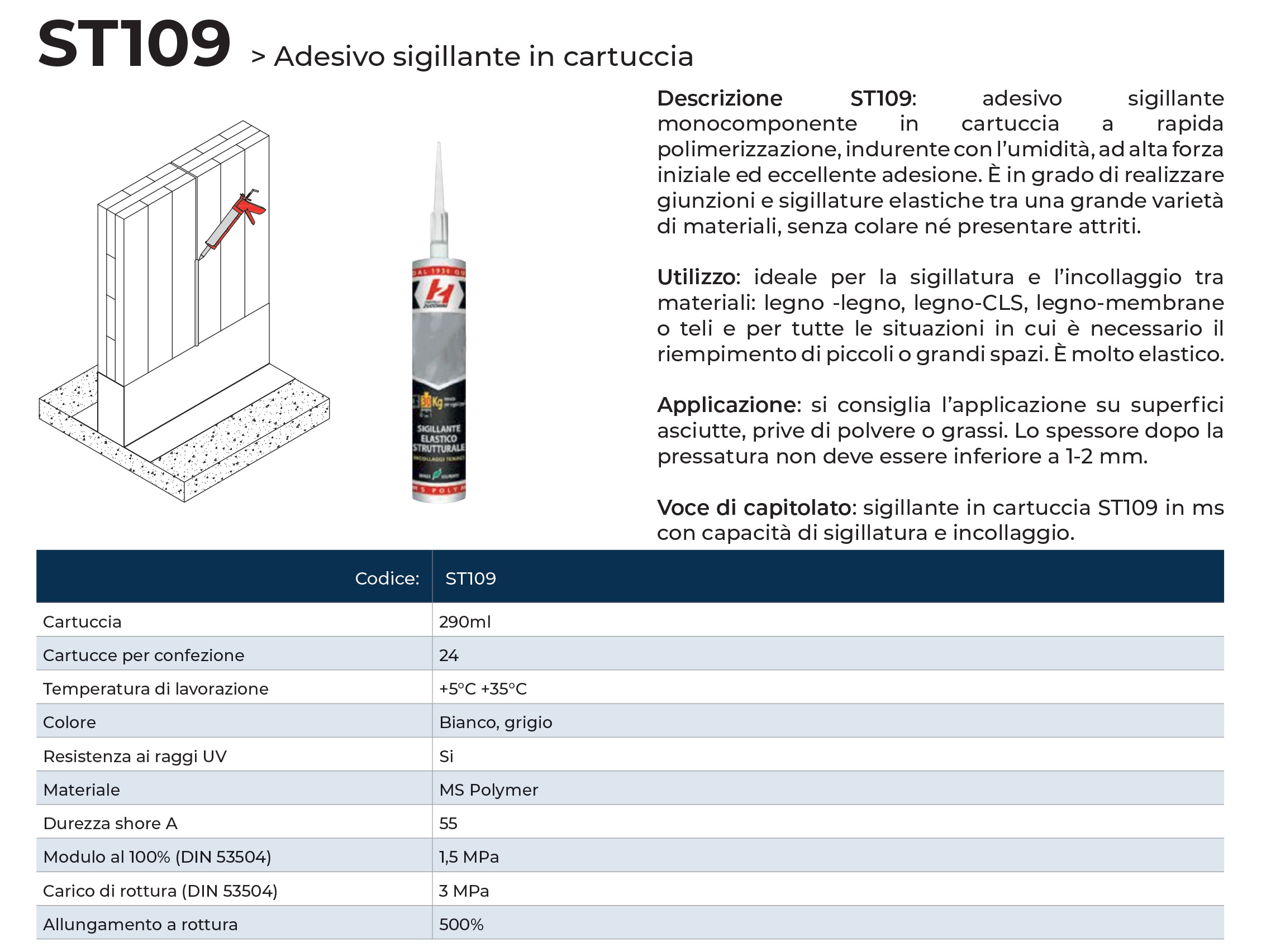 Adesivo sigillante monocomponente polimero MS, in cartuccia, a rapida polimerizzazione, indurente con l'umidità, ad alta forza iniziale ed eccellente adesione, in grado di realizzare giunzioni e sigillature elastiche tra una grande varietà di materiali, senza colare ne presentare ritiri. Consigliato per la sigillatura e l'incollaggio tra materiali quali legno-legno, legno-cls, legno-membrane o teli e per tutte quelle situazioni in cui è necessario il riempimento di piccoli o grandi spazi, grazie alla sua elasticità. Si consiglia l'applicazione su superfici asciutte, prive di polvere o grassi; lo spessore dopo la pressatura non deve essere inferiore a 1-2 mm.