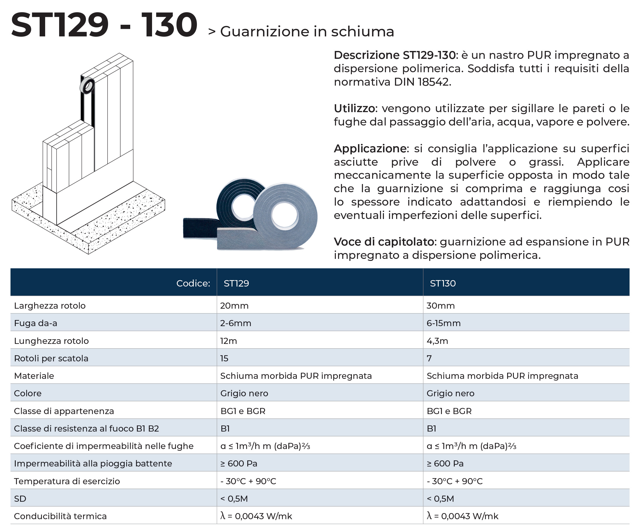 Guarnizione ad espansione adesiva monobanda in rotoli, composta da schiuma poliuretanica elastica, precompressa, adesivizzata con speciale colla acrilica. La guarnizione, una volta posata, aumenta di volume adattandosi alla fuga che deve andare a sigillare. Vengono utilizzate per sigillare le pareti o le fughe dal passaggio dell’aria, acqua, vapore e polvere. Si consiglia l’applicazione su superfici asciutte prive di polvere o grassi. Applicare meccanicamente la superficie opposta in modo tale che la guarnizione si comprima e raggiunga cosi lo spessore indicato adattandosi e riempiendo le eventuali imperfezioni delle superfici.