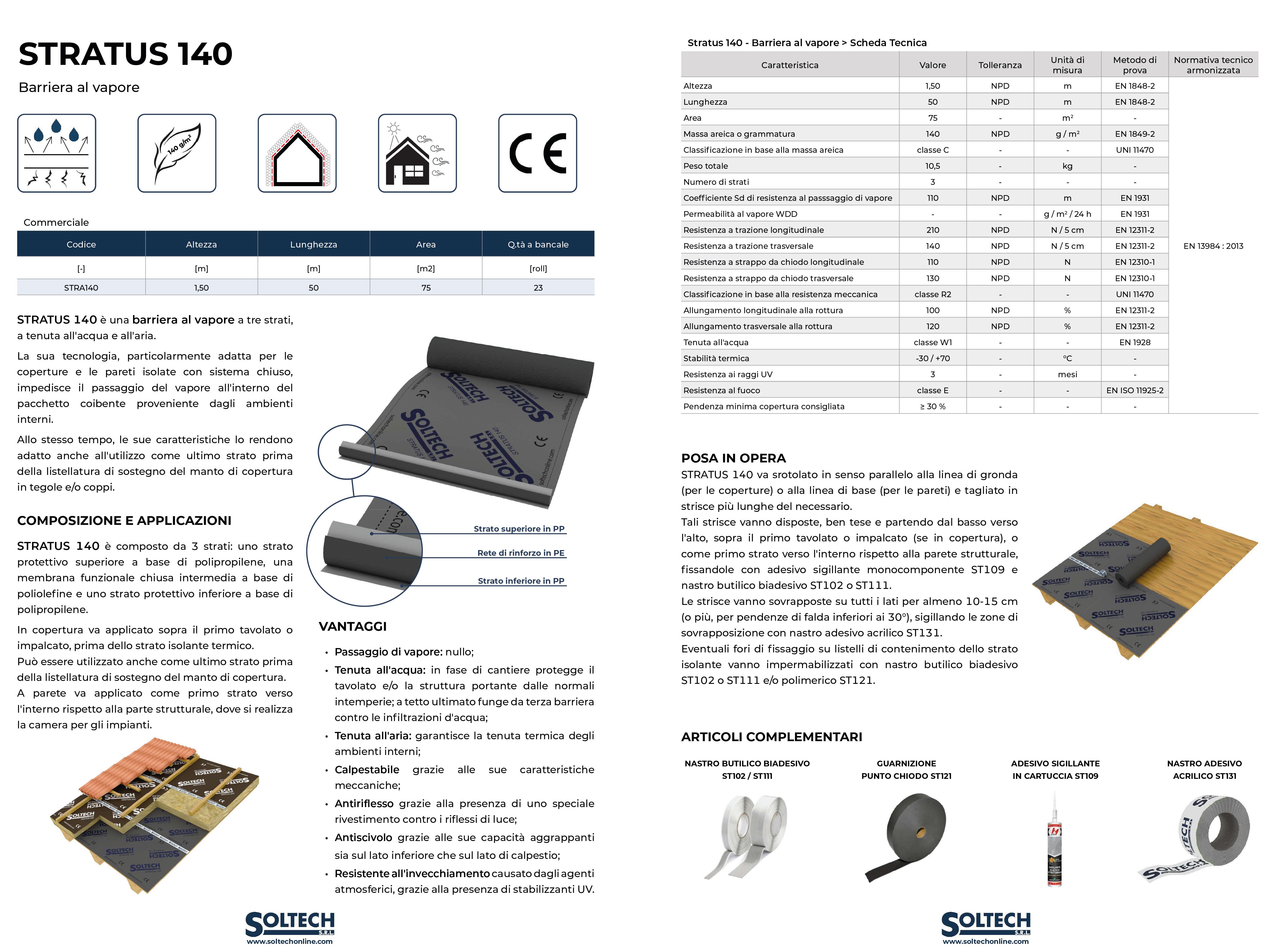 STRATUS 140 è una barriera al vapore a tre strati, a tenuta all'acqua e all'aria. La sua tecnologia, particolarmente adatta per le coperture e le pareti isolate con sistema chiuso, impedisce il passaggio del vapore all'interno del pacchetto coibente proveniente dagli ambienti interni. Allo stesso tempo, le sue caratteristiche lo rendono adatto anche all'utilizzo come ultimo strato prima della listellatura di sostegno del manto di copertura in tegole e/o coppi.