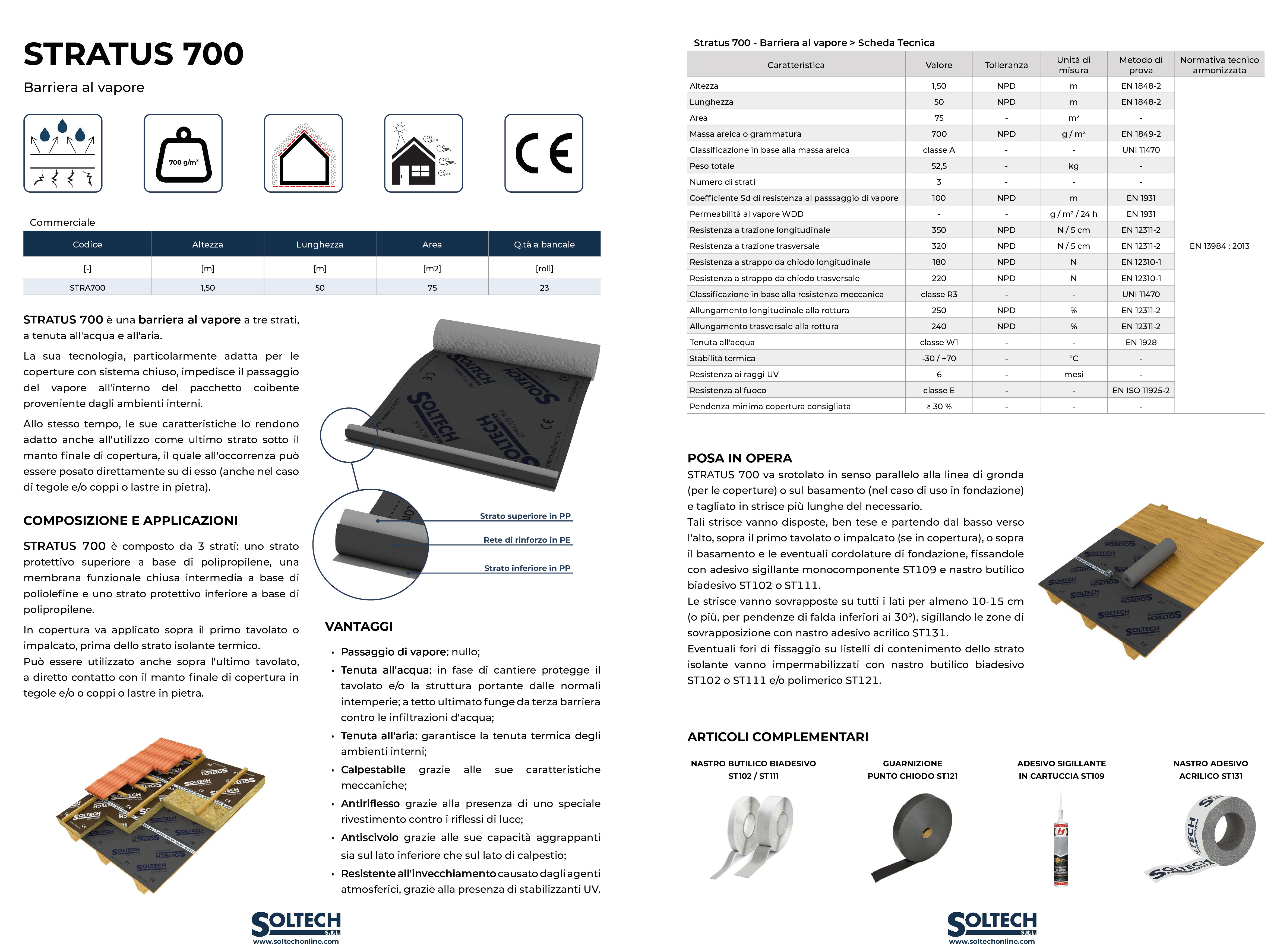 STRATUS 700 č una barriera al vapore a tre strati, a tenuta all'acqua e all'aria. La sua tecnologia, particolarmente adatta per le coperture con sistema chiuso, impedisce il passaggio del vapore all'interno del pacchetto coibente proveniente dagli ambienti interni. Allo stesso tempo, le sue caratteristiche lo rendono adatto anche all'utilizzo come ultimo strato sotto il manto finale di copertura, il quale all'occorrenza puņ essere posato direttamente su di esso (anche nel caso di tegole e/o coppi o lastre in pietra).