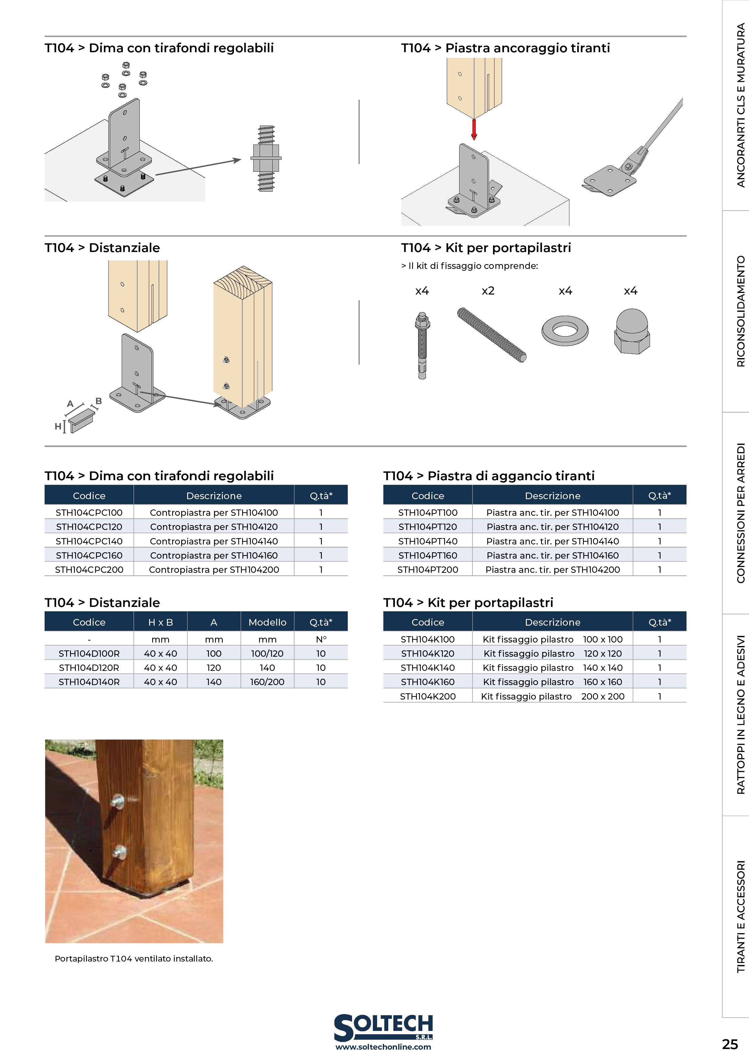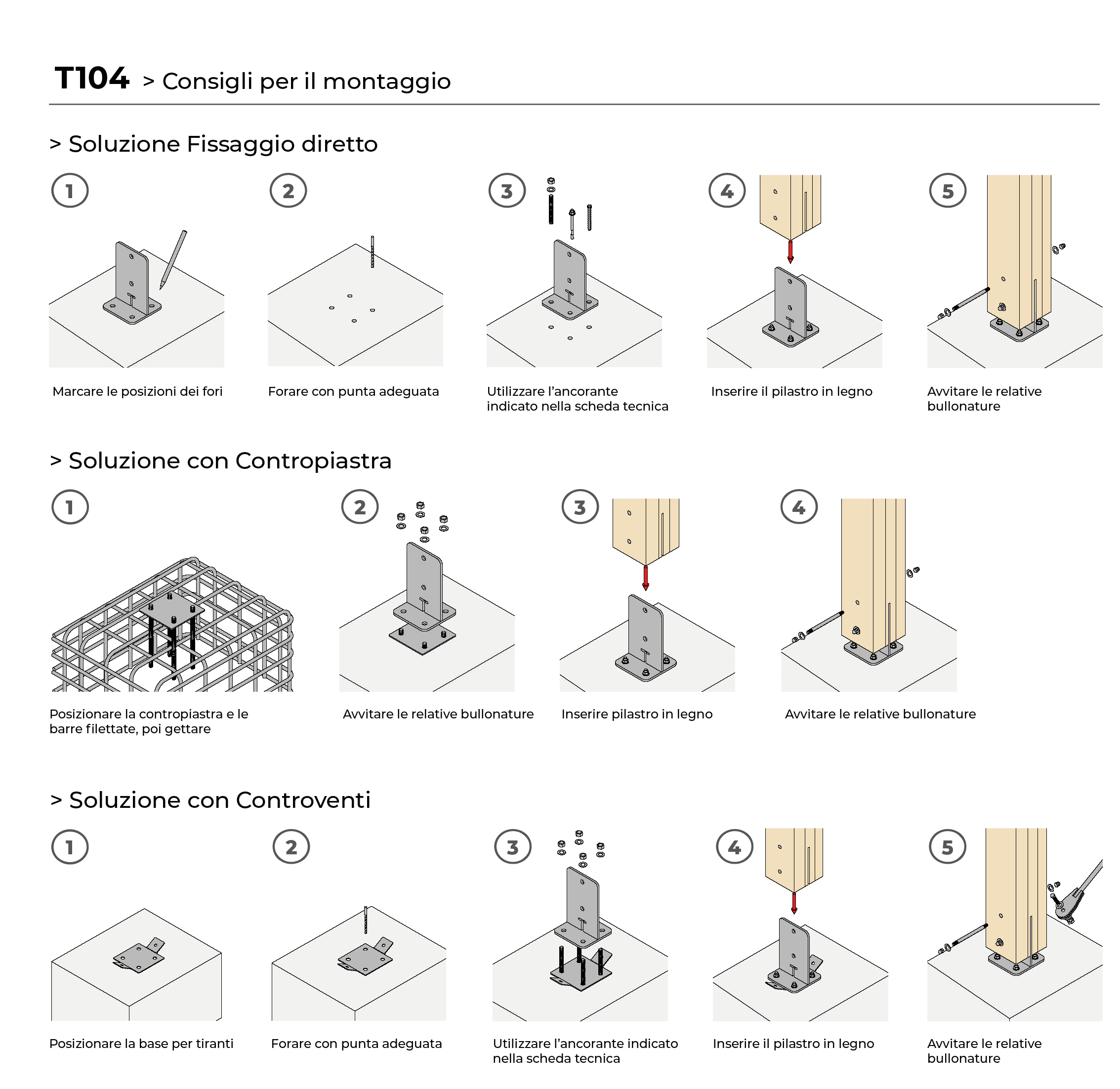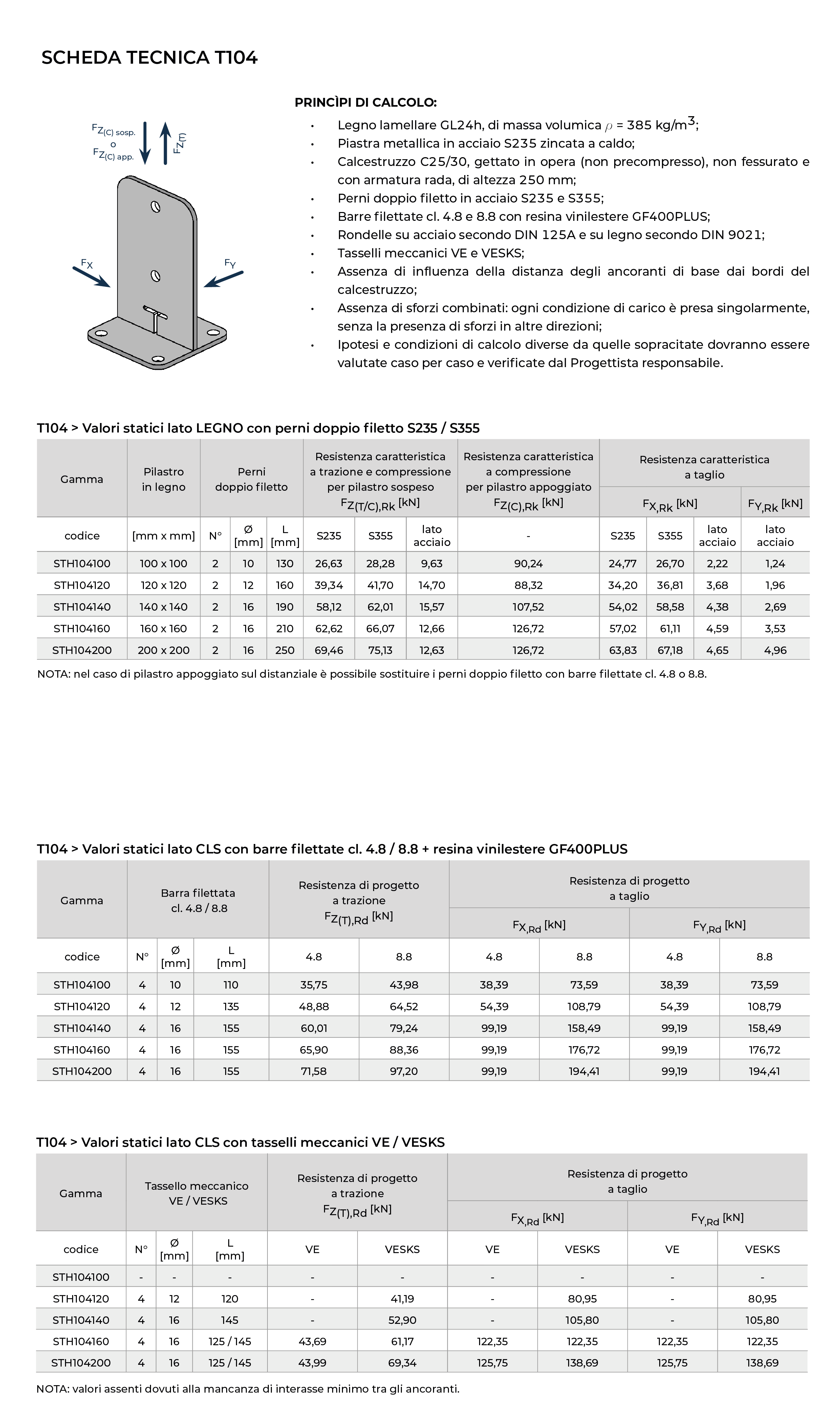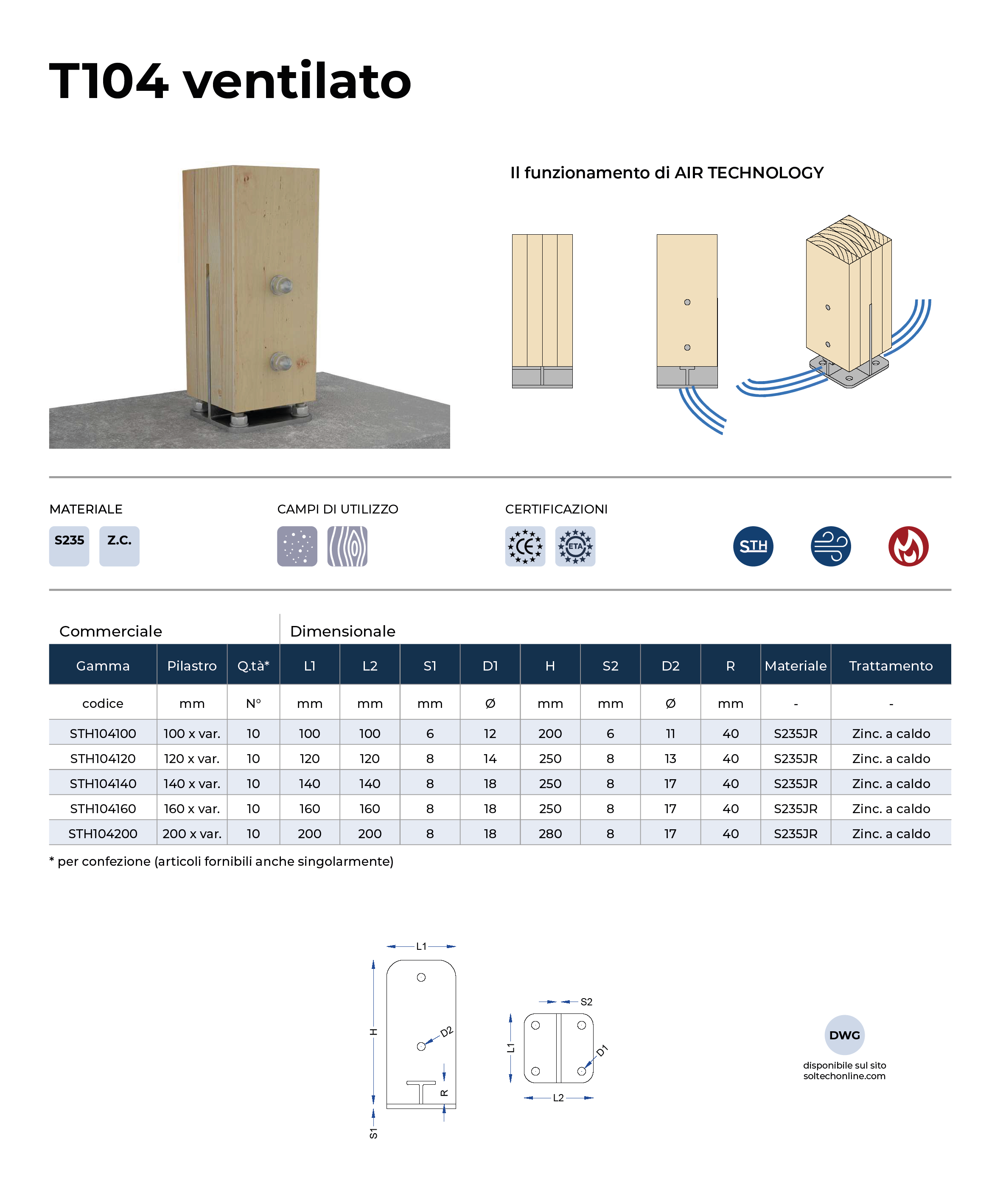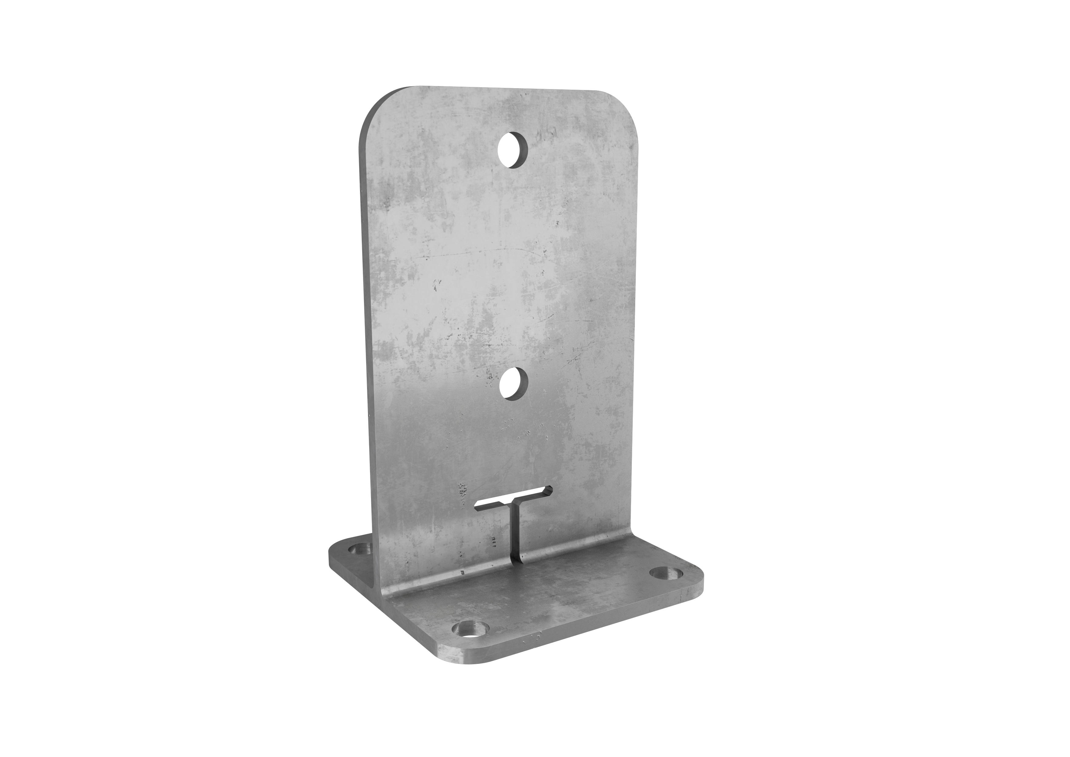 Portapilastri a scomparsa (o a lama interna) in acciaio S235 zincato a caldo. La lama a scomparsa rende il Portapilastro T104 ideale per soddisfare richieste di prevenzione incendi. Utilizzando il suo particolare distanziale il pilastro rimane sollevato da terra permettendo quindi la circolazione dell'aria.