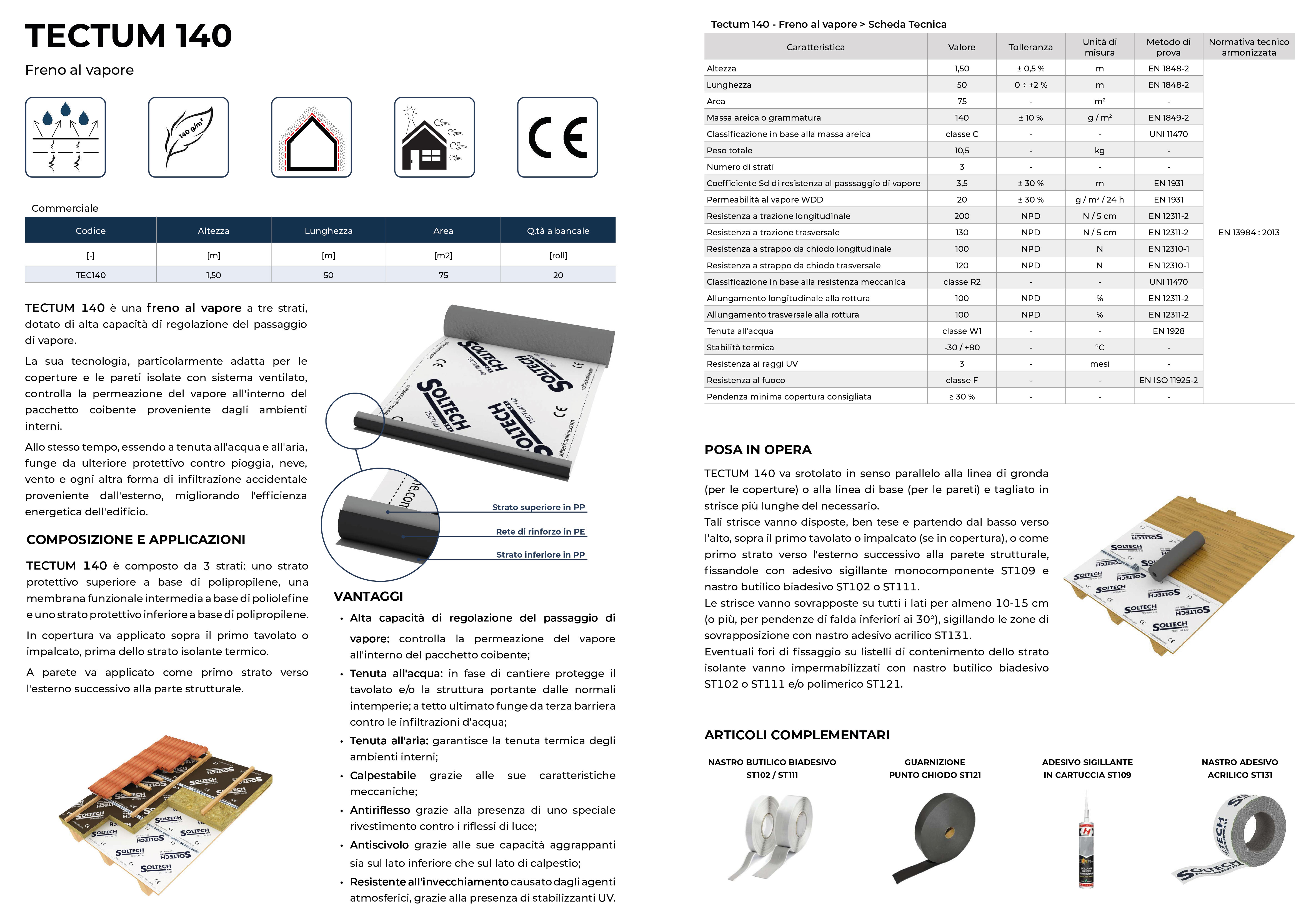 TECTUM 140 è un freno al vapore a tre strati, dotato di alta capacità di regolazione del passaggio di vapore. La sua tecnologia, particolarmente adatta per le coperture e le pareti isolate con sistema ventilato, controlla la permeazione del vapore all'interno del pacchetto coibente proveniente dagli ambienti interni. Allo stesso tempo, essendo a tenuta all'acqua e all'aria, funge da ulteriore elemento protettivo contro pioggia, neve, vento e ogni altra forma di infiltrazione accidentale proveniente dall'esterno, migliorando l'efficienza energetica dell'edificio.