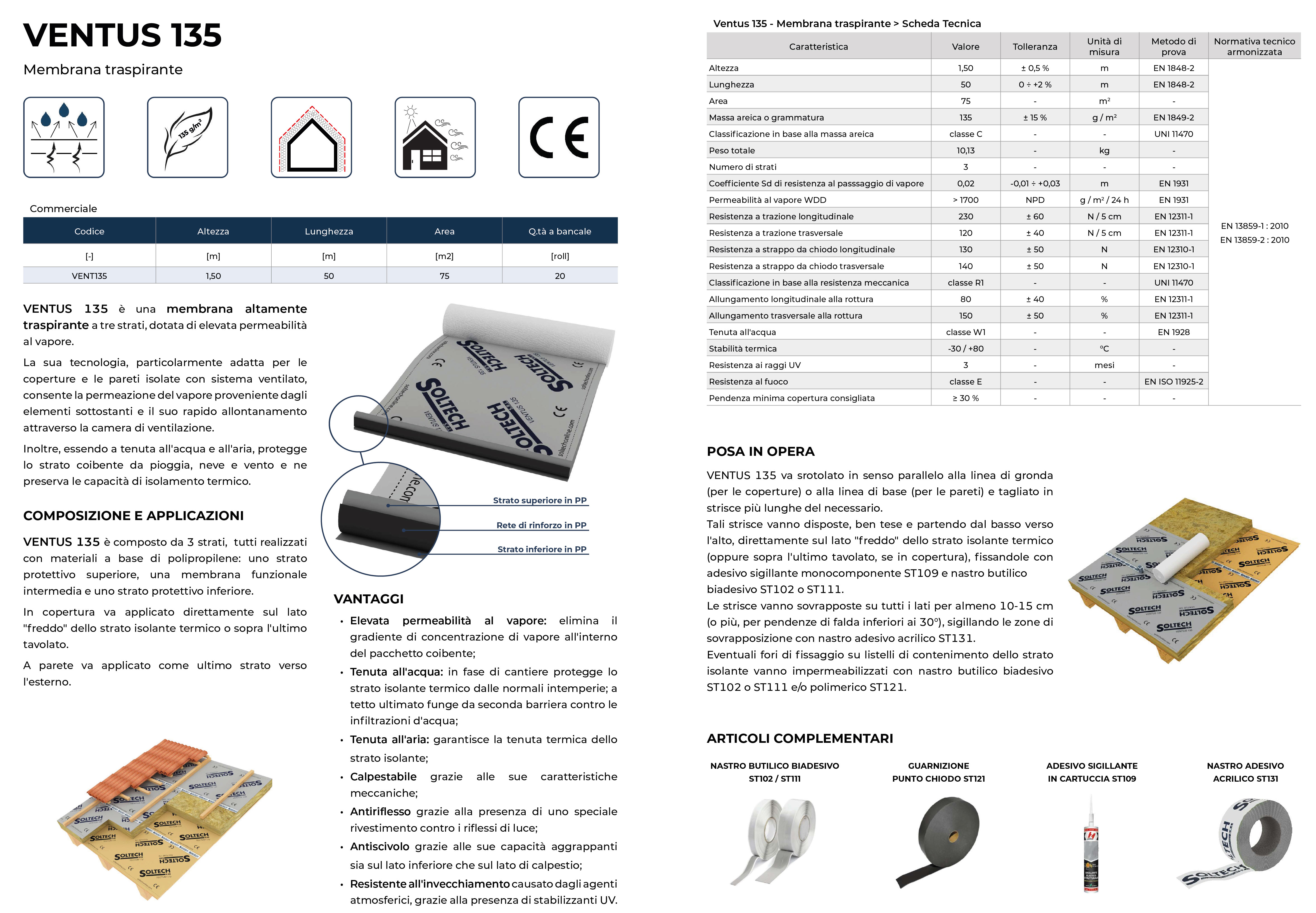 VENTUS 135 è una membrana altamente traspirante a tre strati, dotata di elevata permeabilità al vapore. La sua tecnologia, particolarmente adatta per le coperture e le pareti isolate con sistema ventilato, consente la permeazione del vapore proveniente dagli elementi sottostanti e il suo rapido allontanamento attraverso la camera di ventilazione. Inoltre, essendo a tenuta all'acqua e all'aria, protegge lo strato coibente da pioggia, neve e vento e ne preserva le capacità di isolamento termico.