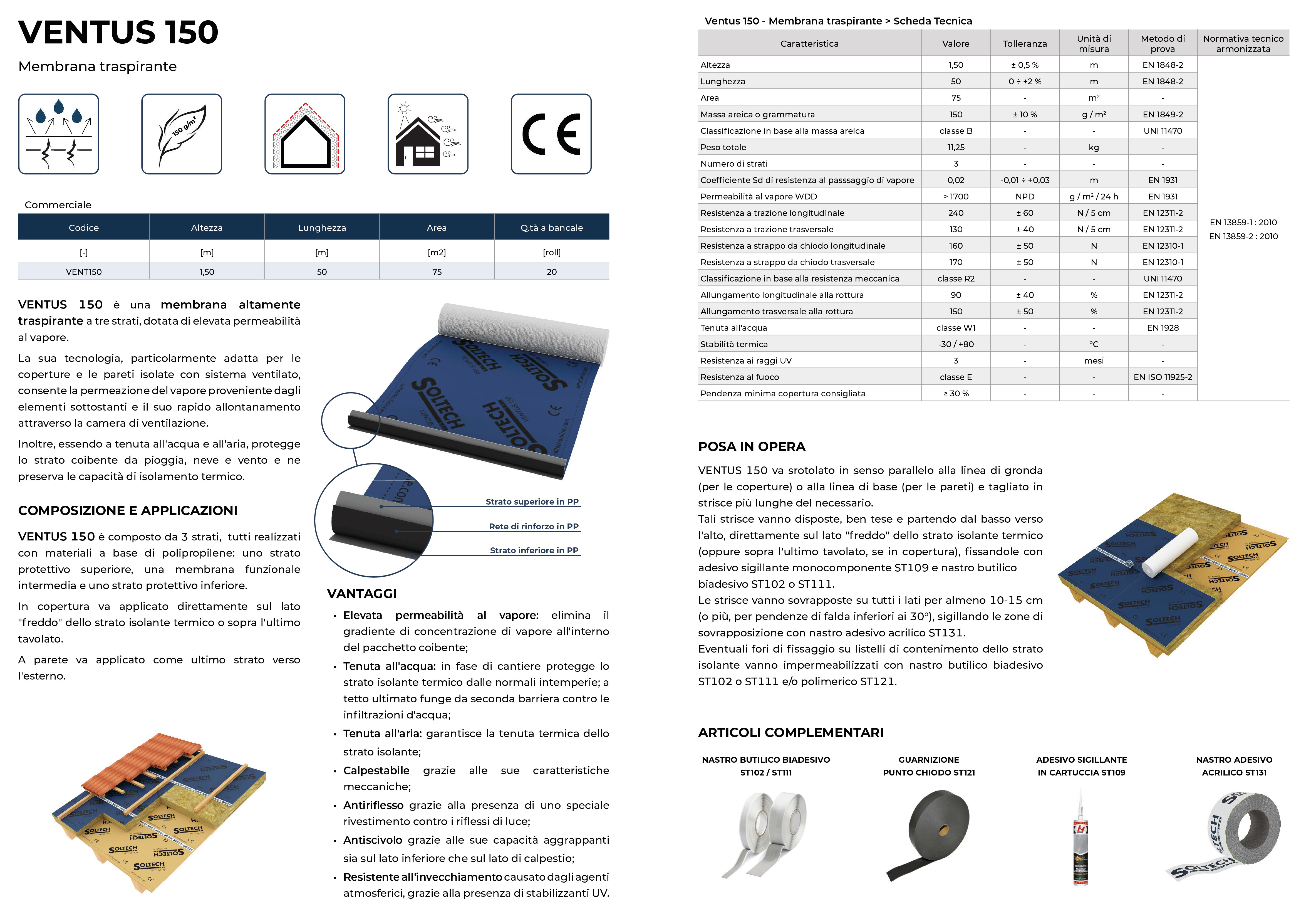 VENTUS 150 è una membrana altamente traspirante a tre strati, dotata di elevata permeabilità al vapore. La sua tecnologia, particolarmente adatta per le coperture e le pareti isolate con sistema ventilato, consente la permeazione del vapore proveniente dagli elementi sottostanti e il suo rapido allontanamento attraverso la camera di ventilazione. Inoltre, essendo a tenuta all'acqua e all'aria, protegge lo strato coibente da pioggia, neve e vento e ne preserva le capacità di isolamento termico.