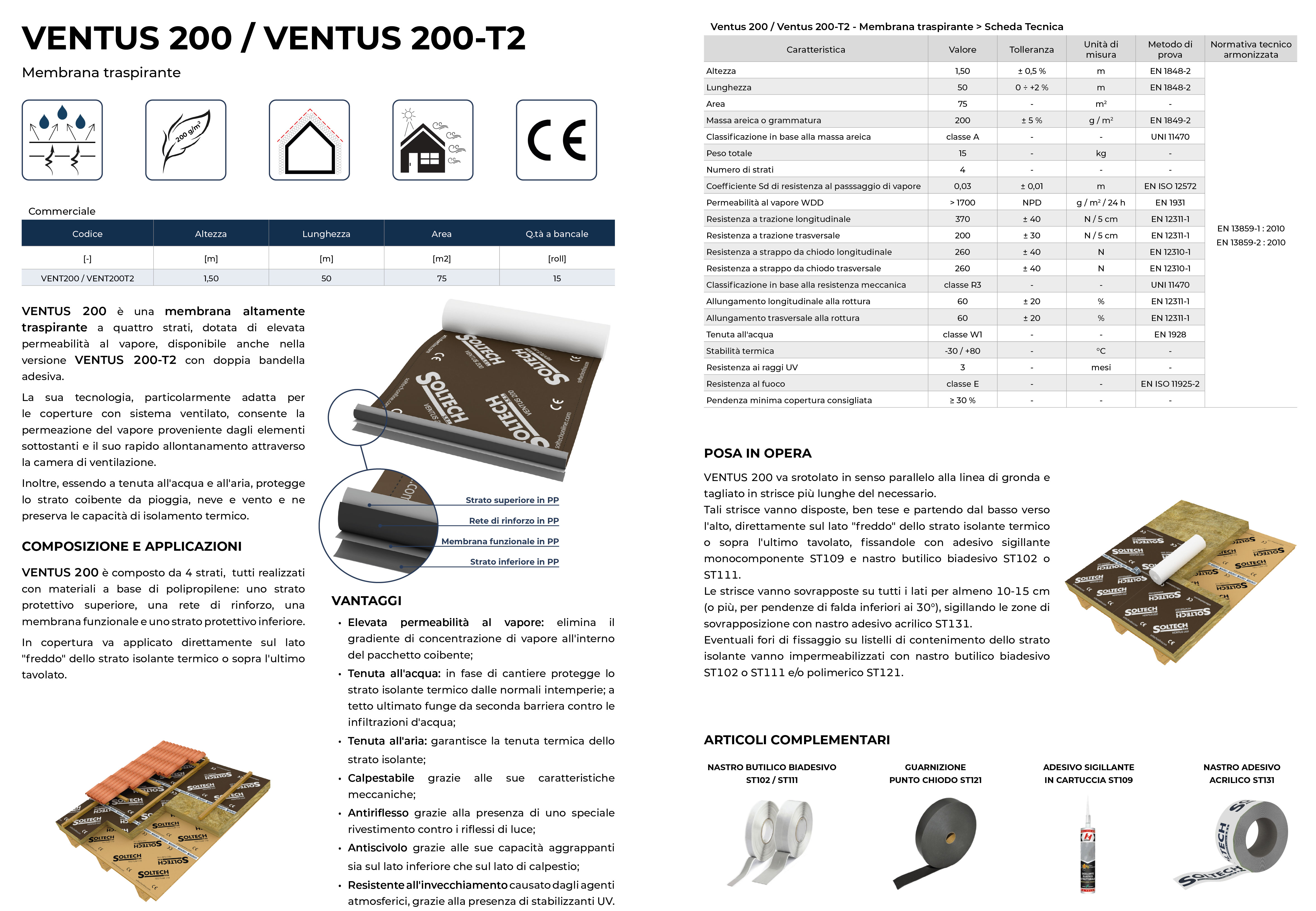 VENTUS 200 è una membrana altamente traspirante a quattro strati, dotata di elevata permeabilità al vapore, disponibile anche nella versione VENTUS 200-T2 con doppia bandella adesiva. La sua tecnologia, particolarmente adatta per le coperture con sistema ventilato, consente la permeazione del vapore proveniente dagli elementi sottostanti e il suo rapido allontanamento attraverso la camera di ventilazione. Inoltre, essendo a tenuta all'acqua e all'aria, protegge lo strato coibente da pioggia, neve e vento e ne preserva le capacità di isolamento termico.
