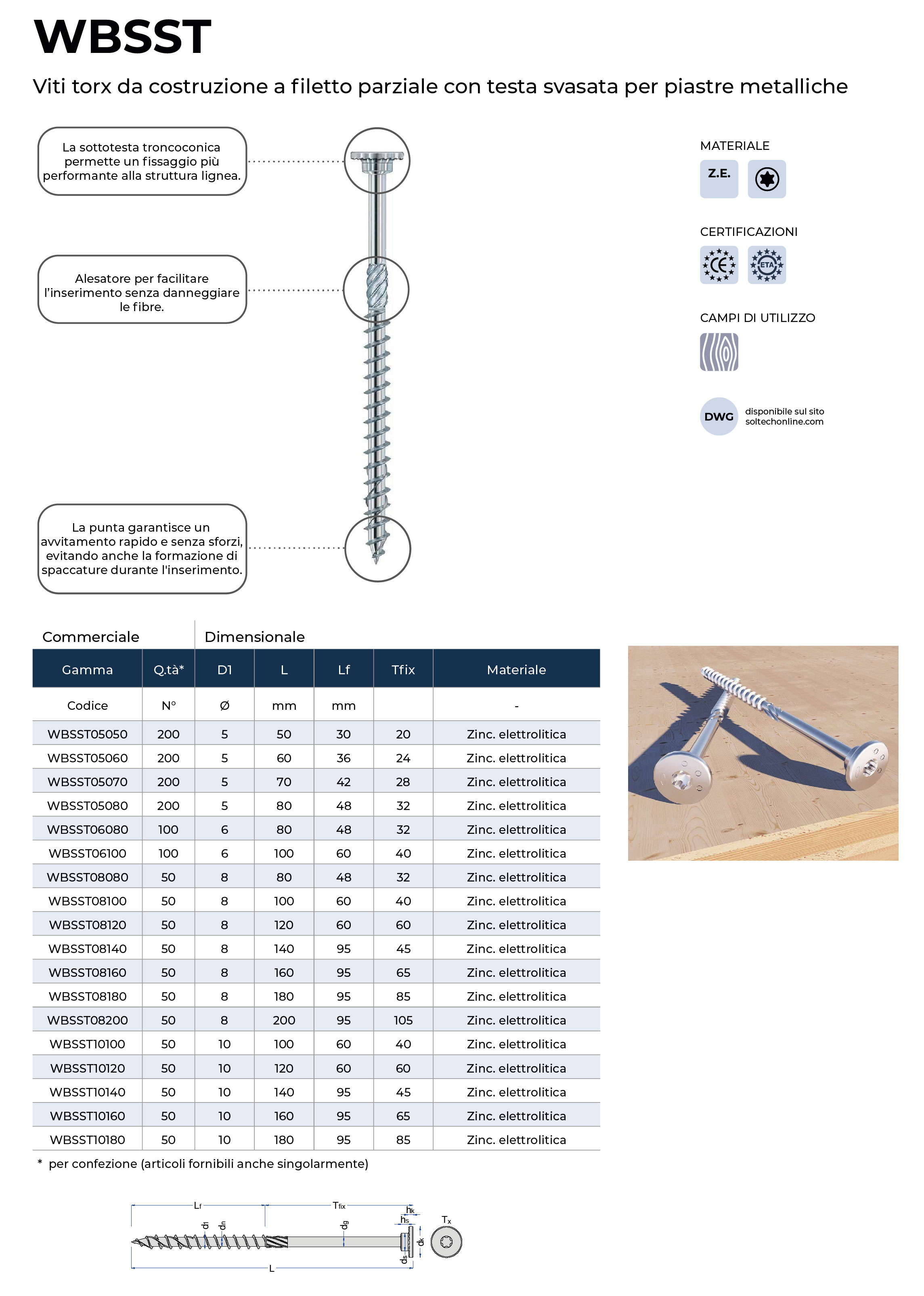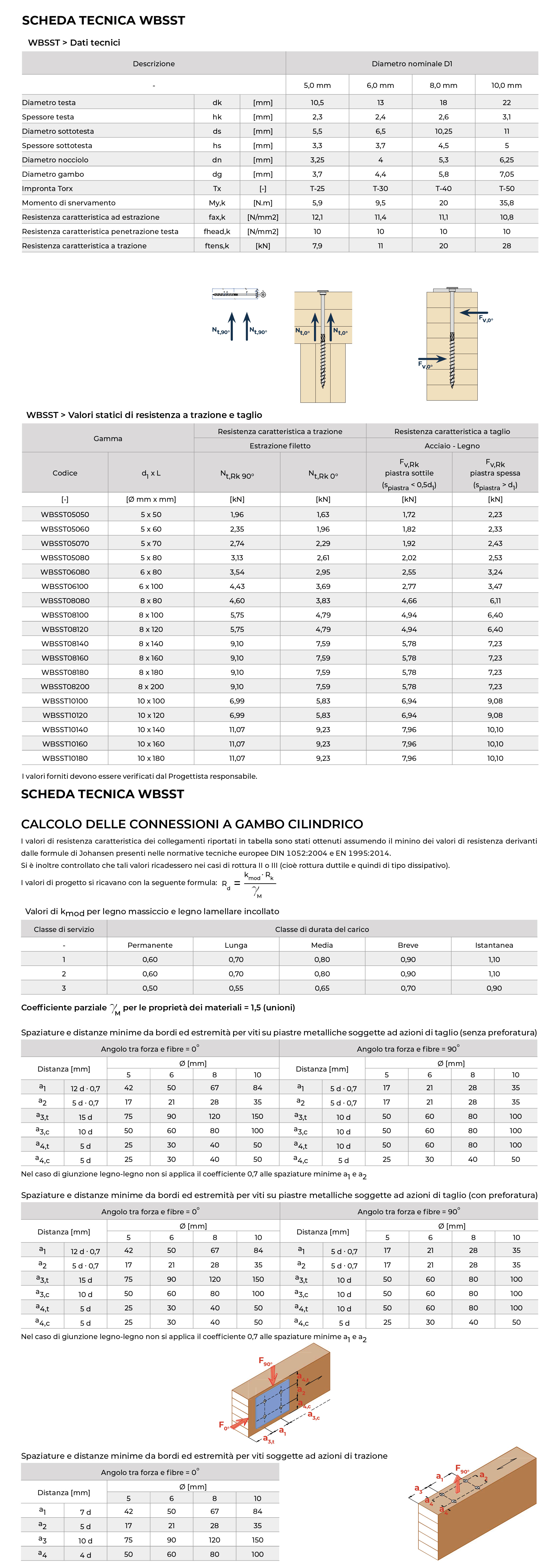 Le viti WBSST sono viti autofilettanti da legno a filetto parziale, con denti a sega sotto una testa a due stadi e una punta speciale. Le viti WBSST possono essere utilizzate in classe di servizio 1 e 2 per la realizzazione di collegamenti strutturali in condizioni di carico stato o quasi statico. Grazie allo spessore e alla forma troncoconica della testa, queste viti sono particolarmente adatte per la realizzazione di collegamenti acciaio-legno, anche nel caso di piastre spesse. Le viti WBSST sono idonee all'utilizzo su legno massiccio, legno lamellare incollato, X-Lam, LVL (microlamellare), legni ad alta densità e pannelli a base di legno.
