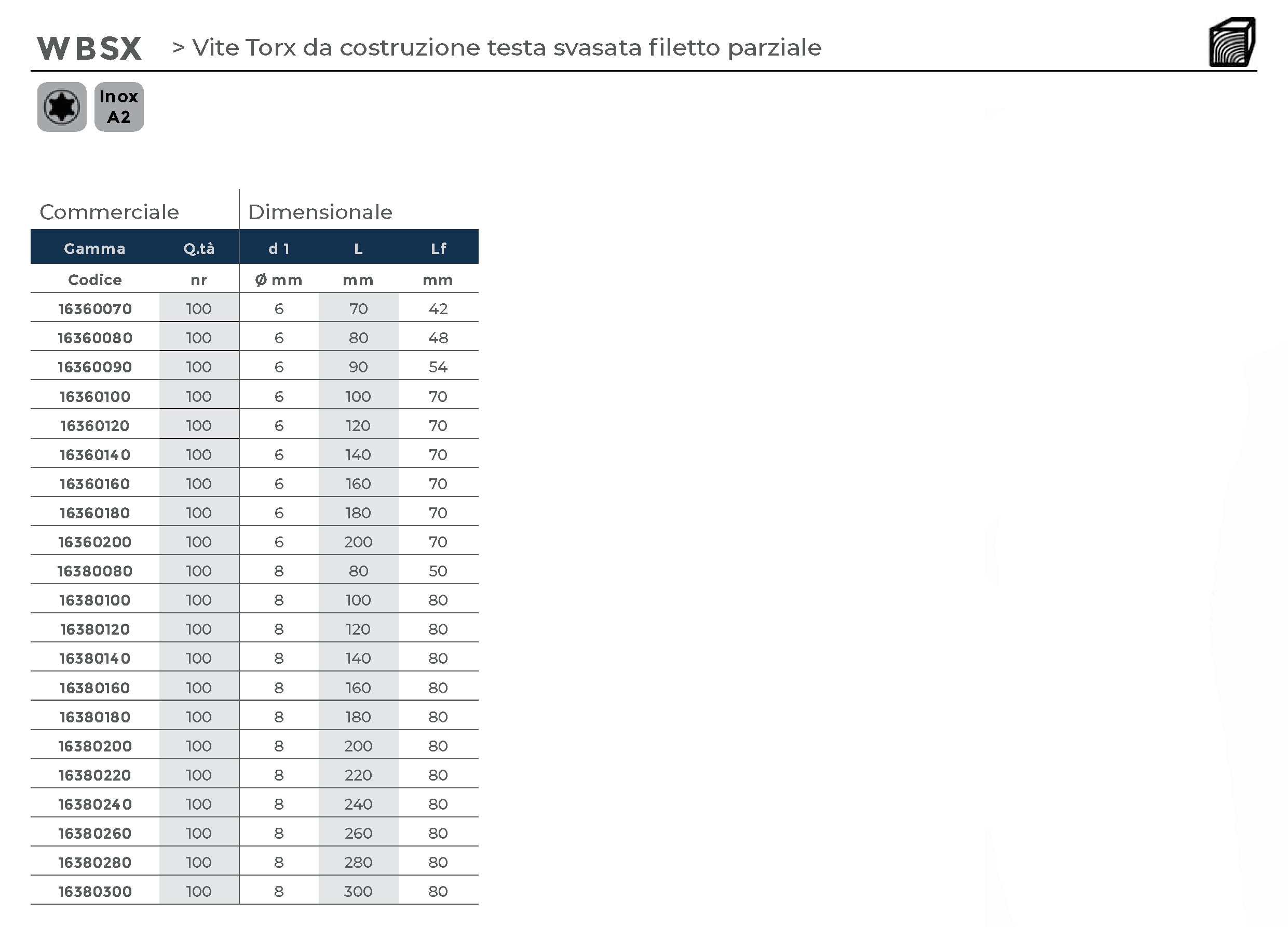 Vite Torx da costruzione con testa svasata e filetto parziale, acciaio INOX